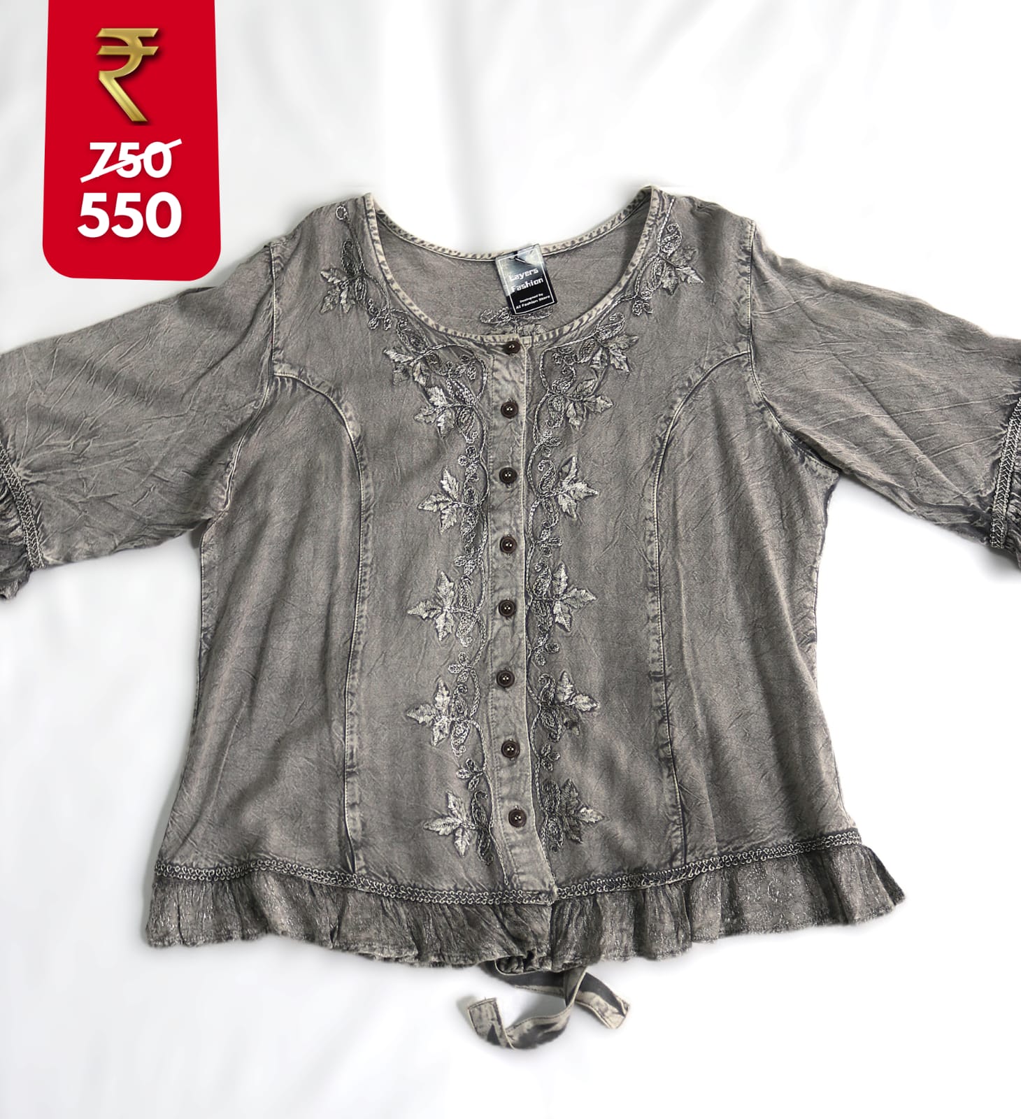 | A grey top with thread embroidery on the neckline and a flared bottom exudes simple elegance. The delicate embroidery adds charm, while the flared hemline gives it a stylish, flowy look—perfect for casual outings or semi-formal occasions. |