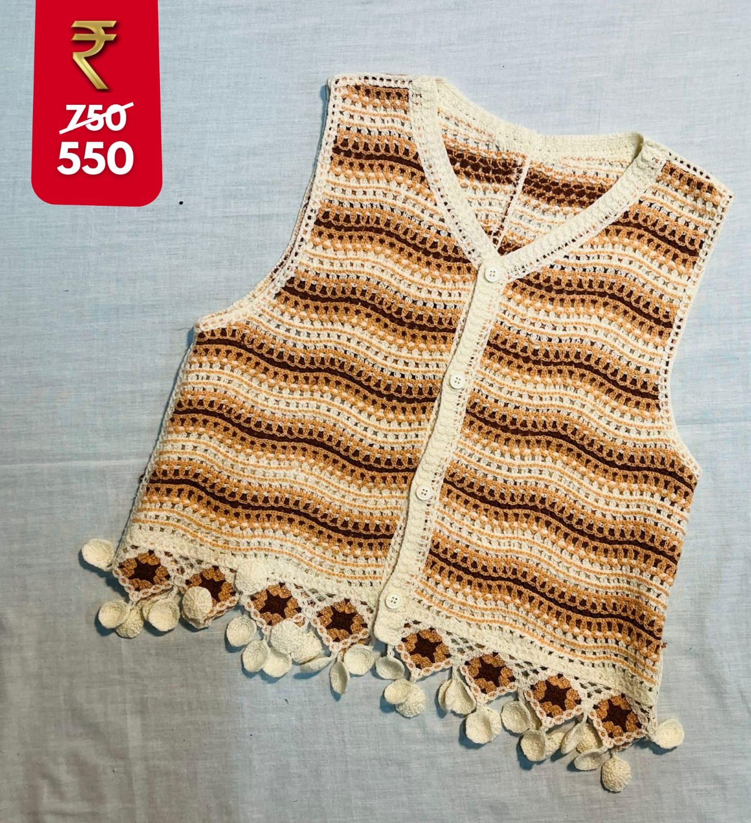 | Sleeveless, button‑front crochet vest featuring a textured brown diamond pattern with contrasting white lacy crochet detailing. The vest is laid flat in the photo with buttons facing up and finished with playful fringe along the bottom hem. Lighting is soft and even, highlighting the stitch texture.