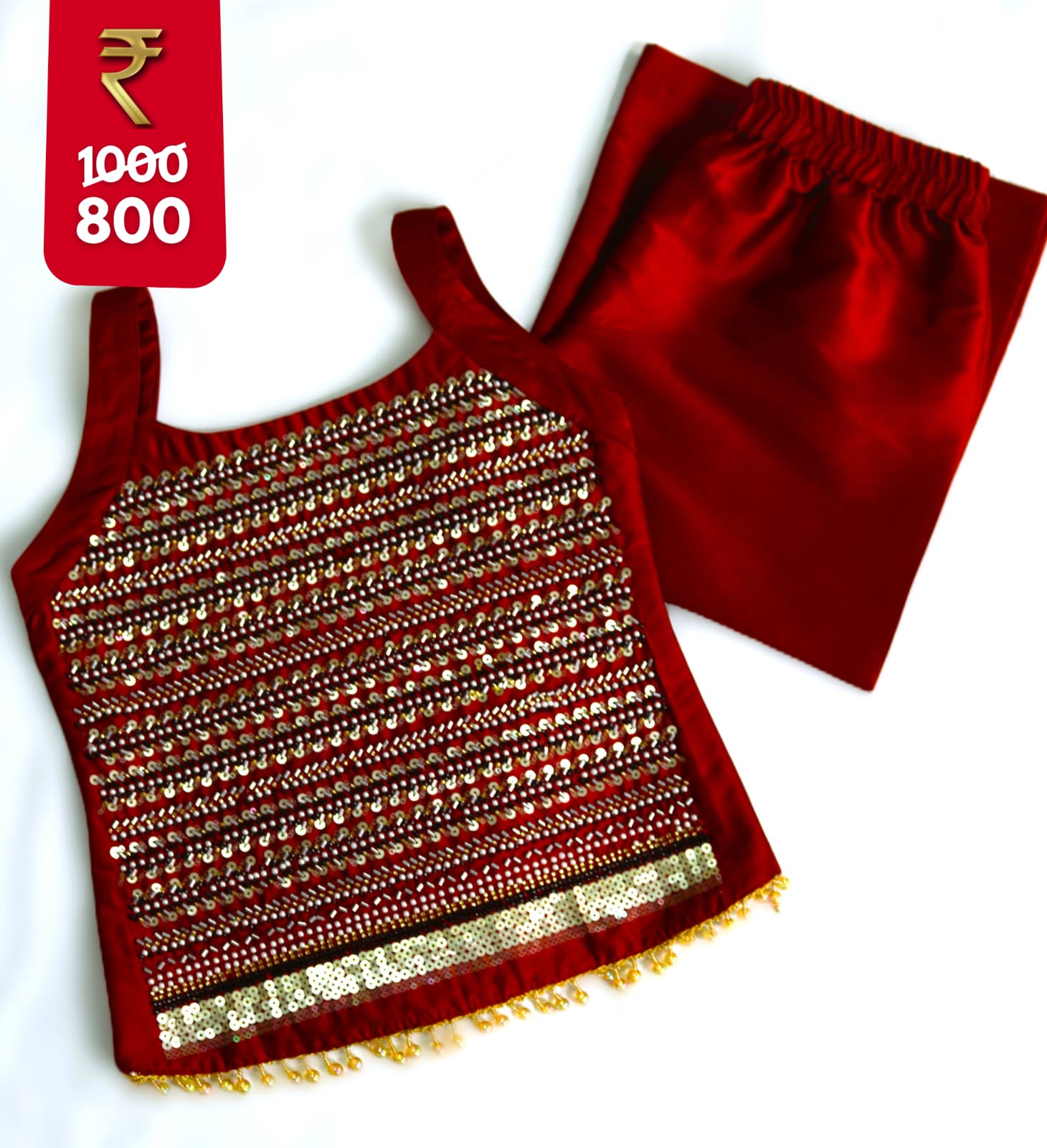 | This elegant red sequin embroidered top and palazzo set is perfect for festive and party wear. The top features intricate golden sequin embroidery with tassel details at the hemline, adding a glamorous touch. It is paired with a comfortable red palazzo, designed with an elastic waistband for ease of wear. The set blends traditional charm with modern style, making it ideal for weddings, receptions, festivals, and special occasions.
