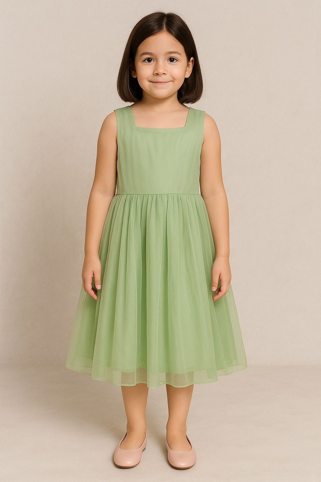 Adorable sage green dress with flowing tulle skirt and fitted bodic