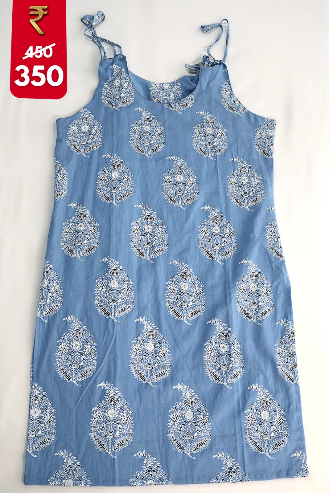 | colour | Sky blue sleeveless top with white paisley print |