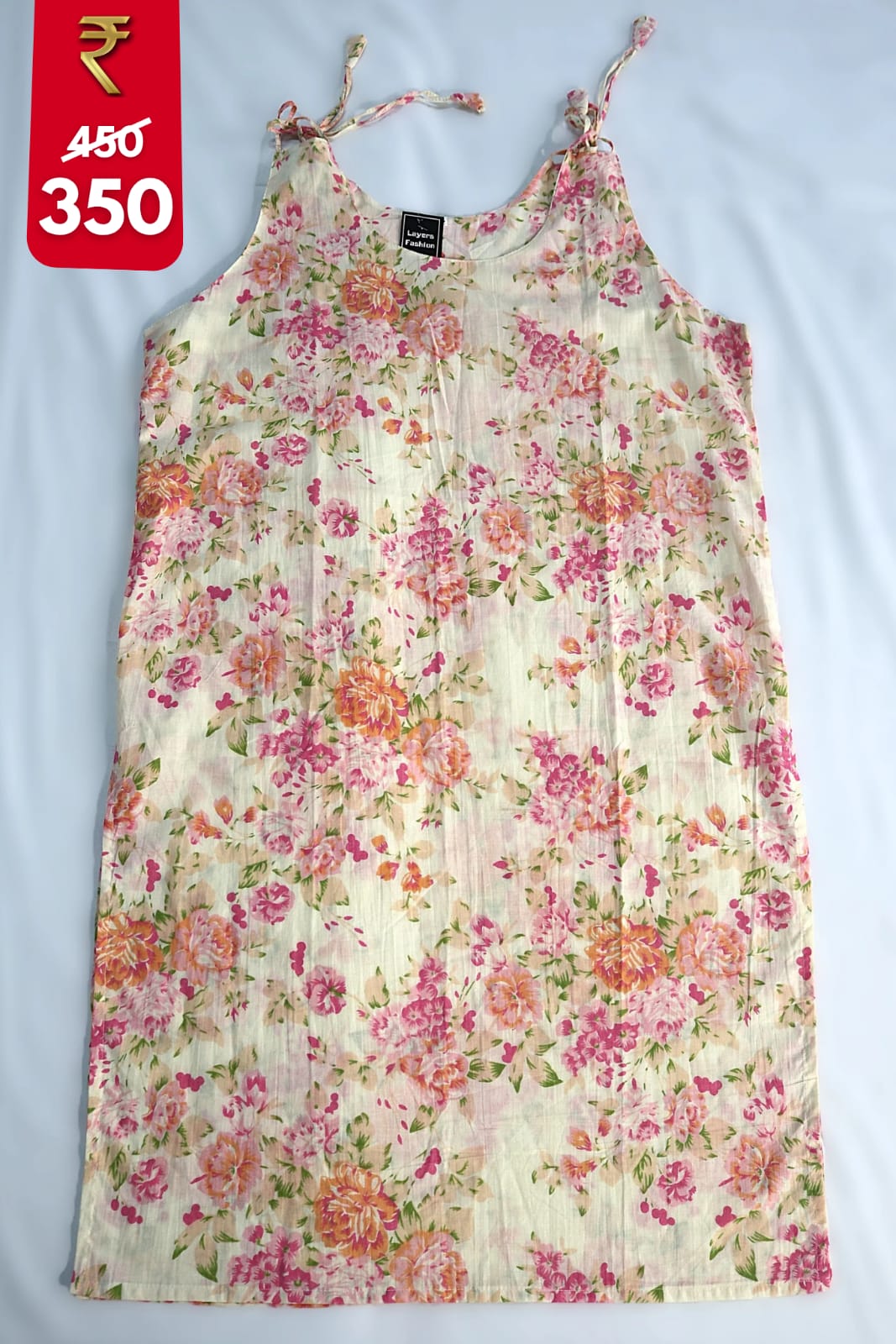 | A stylish cream knotted kurti featuring a floral knotted top design that combines elegance with modern charm. The soft cream base enhances the delicate floral patterns, creating a graceful and versatile look. |