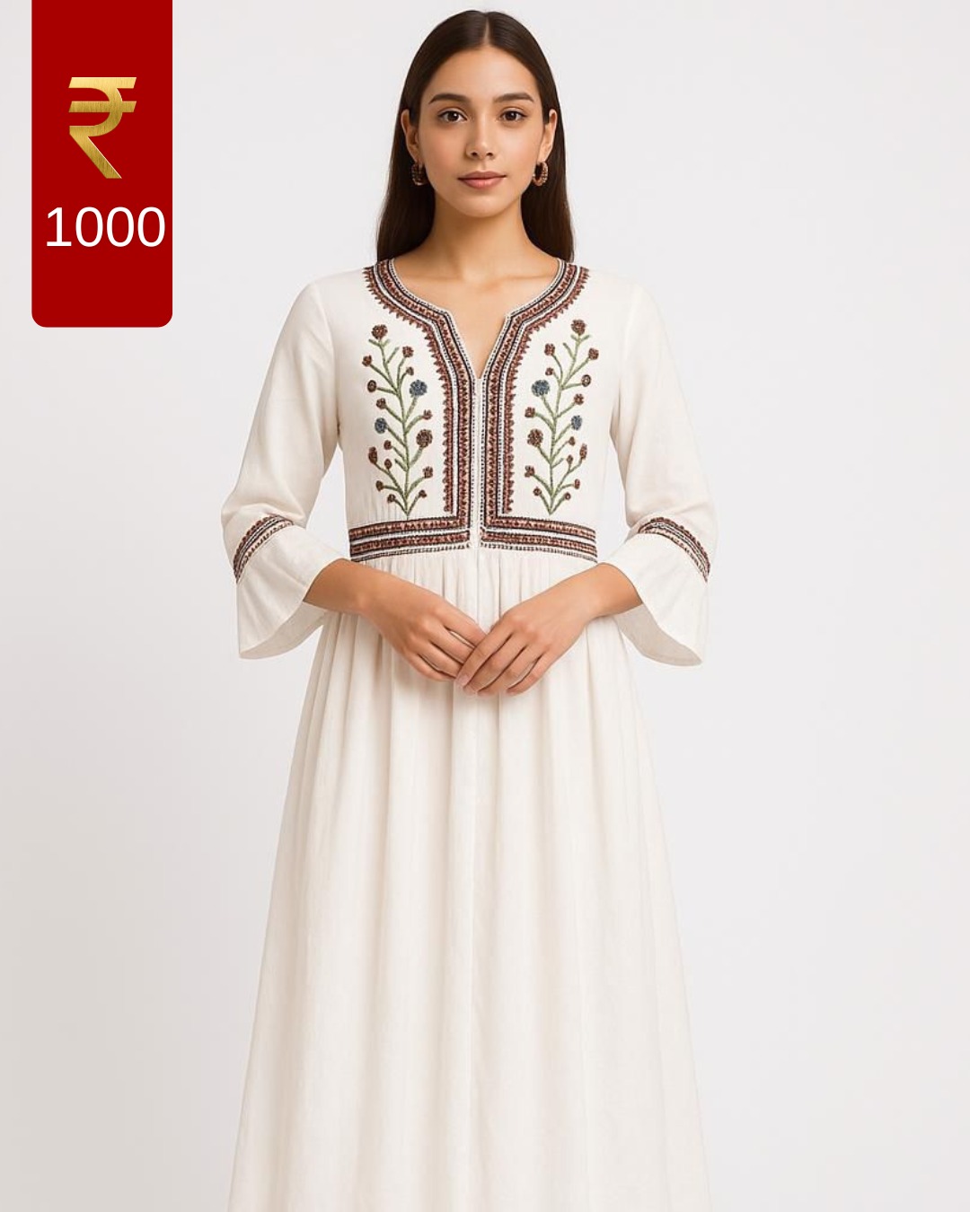 | colour | white kurti with multicolor embroidery, बहुरंगी कढ़ाई वाली सफेद कुर्ती |