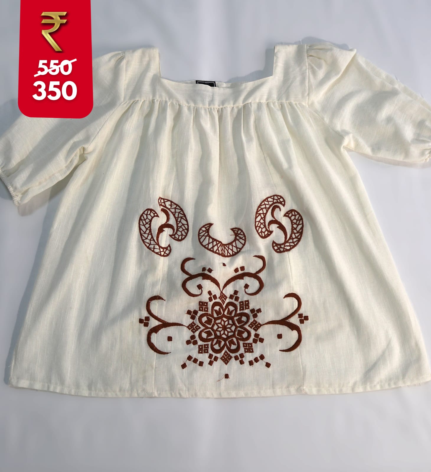 | A white cotton top with brown thread embroidery is a light, breathable garment made from soft cotton fabric. The crisp white base gives it a clean and fresh look, while the brown embroidery adds a touch of earthy elegance |